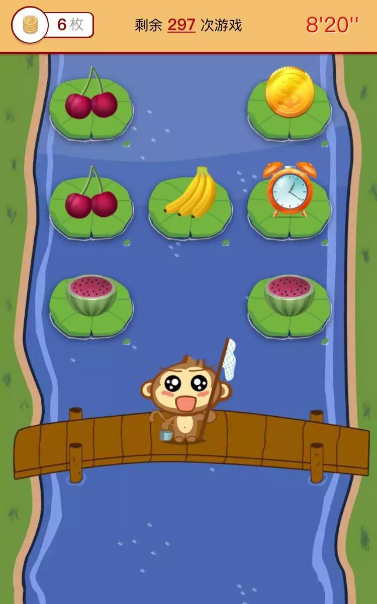 開始游戲后,將在河流向“猴子”方向飄來(lái)水果、金幣、鬧鐘三類物品。請(qǐng)手指點(diǎn)擊想撈的物品方向所對(duì)的橋面位置,“猴子”會(huì)自動(dòng)跑過(guò)去撈取它前面的物品。