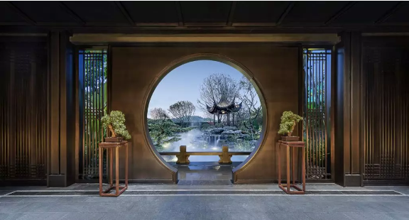 “江山無(wú)限景,都聚一亭中”,在可園,由曲橋連著湖中心的可亭,可欣賞湖光美景。珠海璽園的“邀月亭”也是園中勝景,以傳統(tǒng)中式榫卯結(jié)構(gòu)搭建,亭脊用花瓶狀石雕打造,屋頂以魚(yú)鱗溝瓦來(lái)鋪設(shè),檐口滴水瓦當(dāng)耐人尋味。