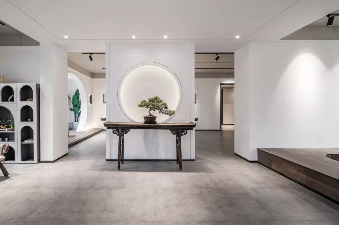 迎賓門(mén)以中國(guó)傳統(tǒng)的“月門(mén)”來(lái)規(guī)劃空間,形如滿月、透光而幽靜,在入廊穿月的過(guò)程中,產(chǎn)生層層遞進(jìn)的空間體驗(yàn)。