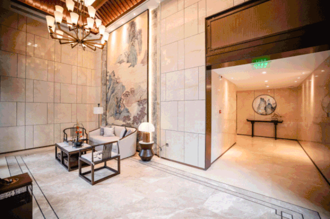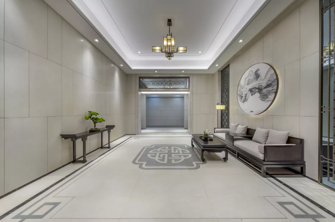 每一個(gè)細(xì)節(jié)都充滿考究,連電梯的轎廂門(mén)廳地面設(shè)計(jì),也采用了中式線條地拼。