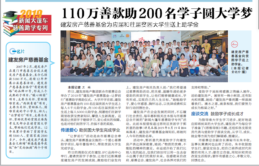 建發(fā)房產(chǎn)在企業(yè)發(fā)展的同時(shí),不忘履行社會(huì)責(zé)任,每年都積極關(guān)注廈門(mén)日?qǐng)?bào)與市慈善總會(huì)開(kāi)展的“新聞大篷車(chē)慈善助學(xué)專(zhuān)列”活動(dòng)。此前廈門(mén)日?qǐng)?bào)曾報(bào)道過(guò)思明區(qū)貧困學(xué)子郭祈恩的故事(廈門(mén)日?qǐng)?bào)2019年8月19日B04版報(bào)道),建發(fā)房產(chǎn)慈善基金得知后,將她列入今年的捐助名單。