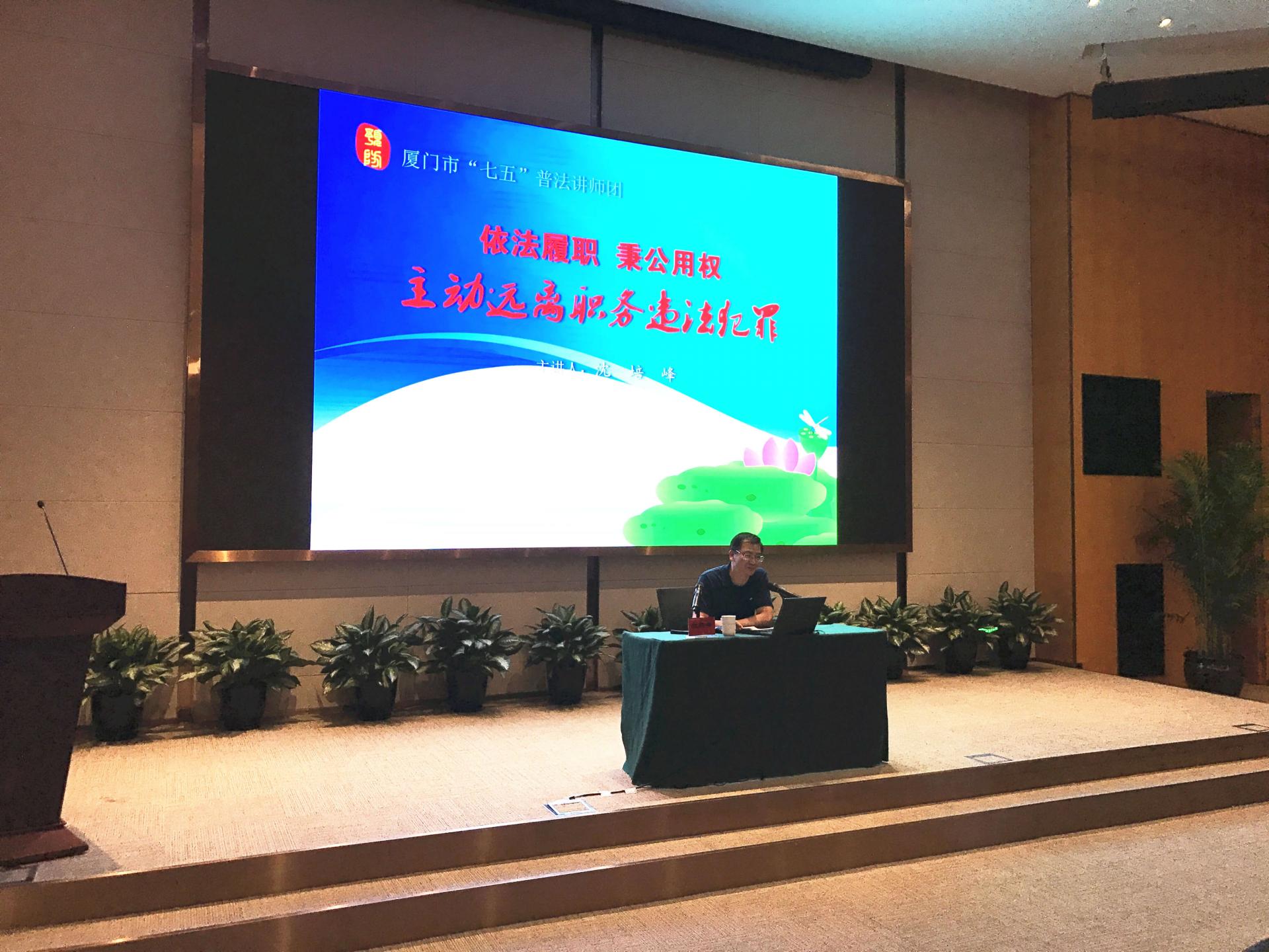 本次講座由廈門市紀委宣傳部副部長沈培峰主講,沈部長以“依法履職,秉公用權(quán)——主動遠離職務(wù)違法犯罪”為題,從反腐敗查辦案件基本情況、分領(lǐng)域政治精準反腐啟示、職務(wù)違法犯罪的預(yù)防建議等方面,結(jié)合實際案例,對職務(wù)犯罪造成的危害進行深刻剖析。沈部長認為,遠離職務(wù)犯罪要以案為鑒,謹記犯罪風(fēng)險;抓早抓小,注重防微杜漸;排查風(fēng)險,突出預(yù)防重點。